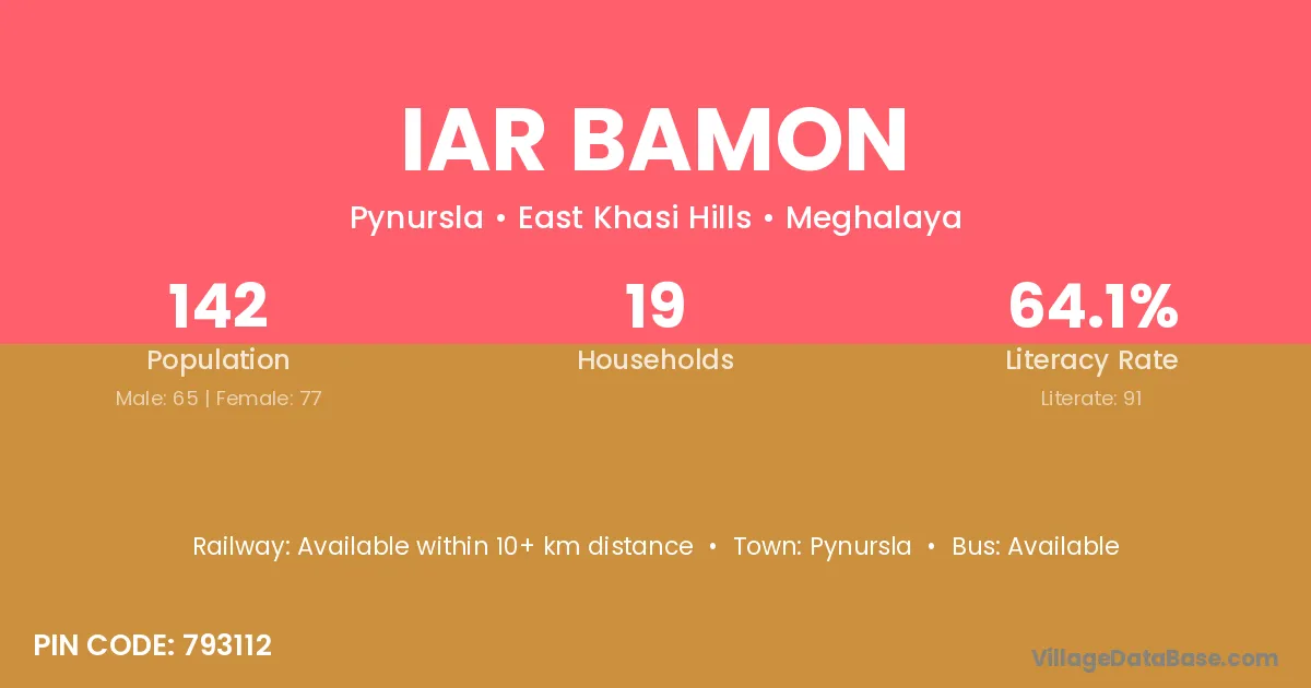 Iar Bamon village has a total population of 142 people, of which 65 are males and 77 are females.