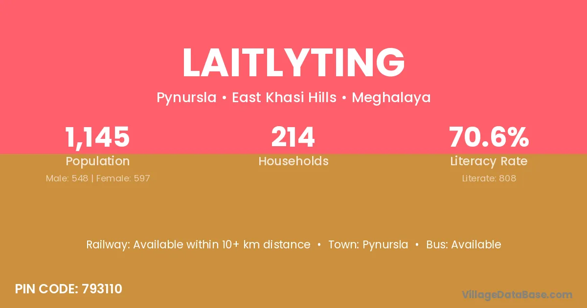 Laitlyting village has a total population of 1,145 people, of which 548 are males and 597 are females.
