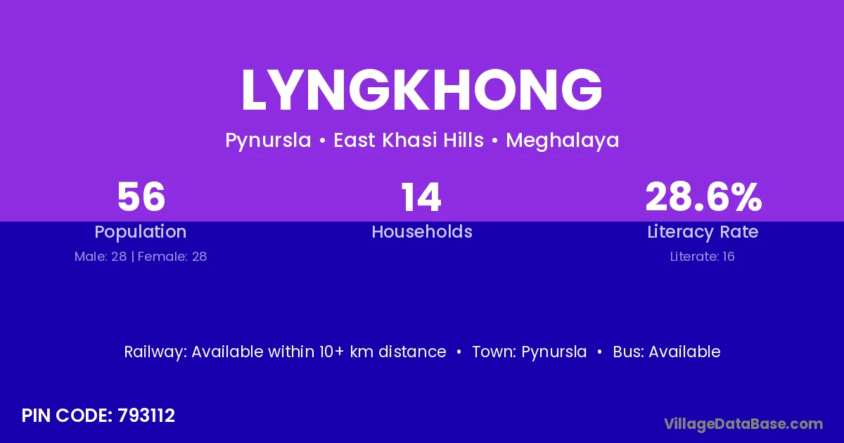 Lyngkhong village has a total population of 56 people, of which 28 are males and 28 are females.