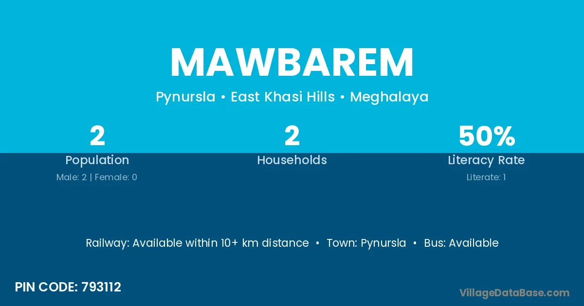 The literacy rate of Mawbarem village is 50.00%. Male literacy stands at 50.00% and female literacy at 0%.
