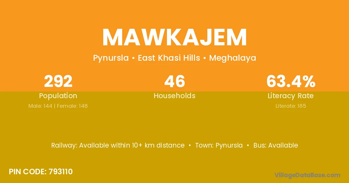 Mawkajem village has a total population of 292 people, of which 144 are males and 148 are females.