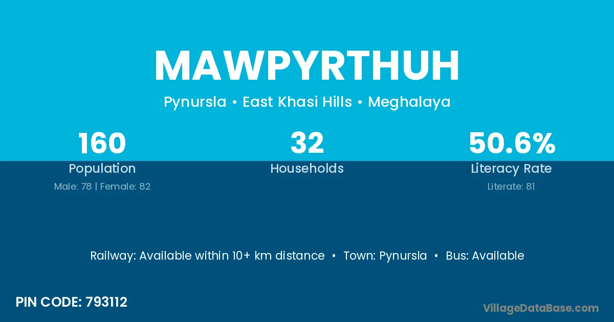 The literacy rate of Mawpyrthuh village is 50.63%. Male literacy stands at 57.69% and female literacy at 43.90%.