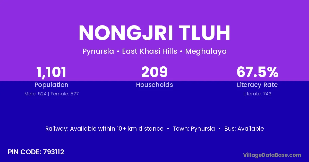 Nongjri Tluh village has a total population of 1,101 people, of which 524 are males and 577 are females.