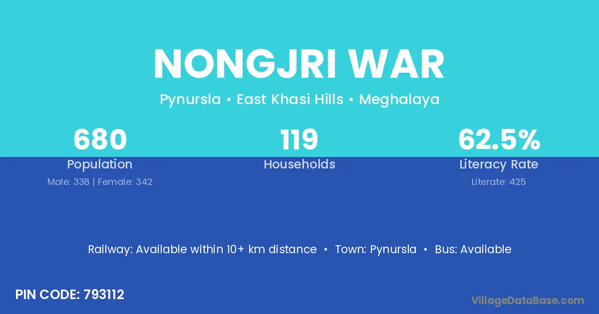Nongjri War village has a total population of 680 people, of which 338 are males and 342 are females.