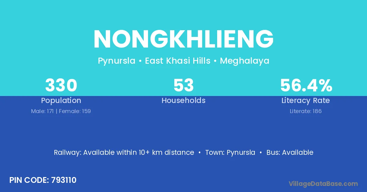 The literacy rate of Nongkhlieng village is 56.36%. Male literacy stands at 56.14% and female literacy at 56.60%.