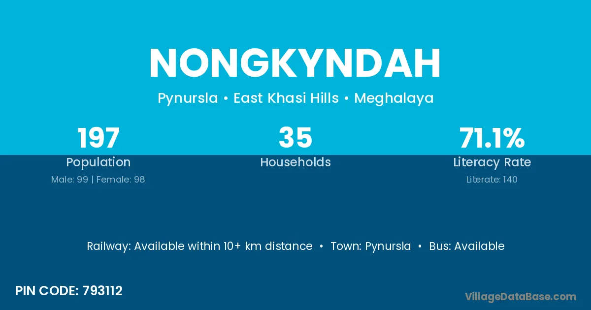Nongkyndah village has a total population of 197 people, of which 99 are males and 98 are females.