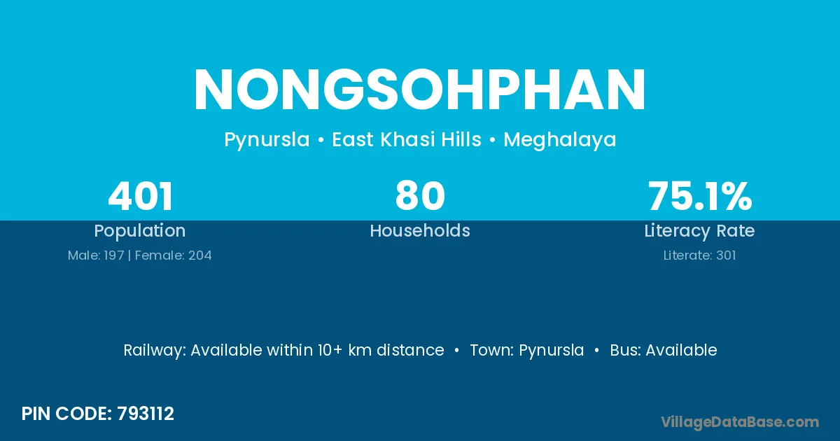 Nongsohphan village has a total population of 401 people, of which 197 are males and 204 are females.