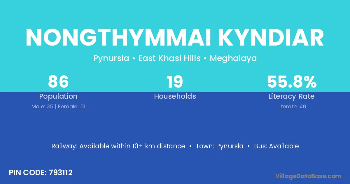Nongthymmai Kyndiar village has a total population of 86 people, of which 35 are males and 51 are females.