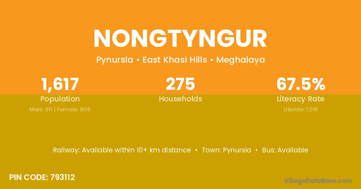 Nongtyngur village has a total population of 1,617 people, of which 811 are males and 806 are females.