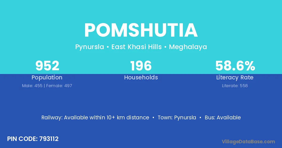 Pomshutia village has a total population of 952 people, of which 455 are males and 497 are females.