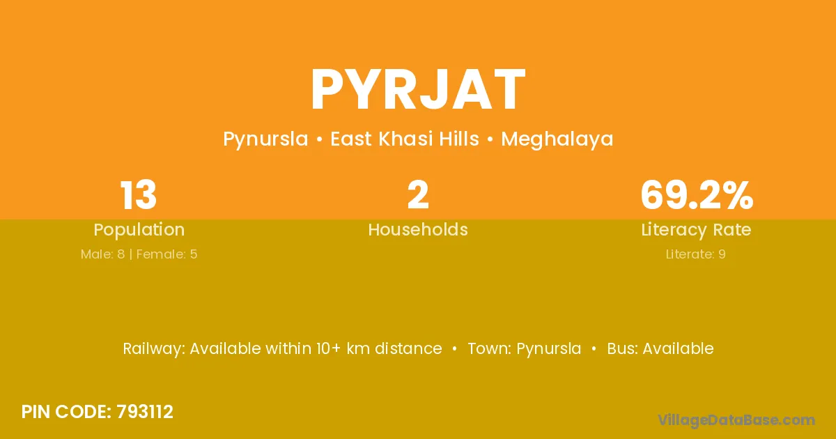 Pyrjat village has a total population of 13 people, of which 8 are males and 5 are females.