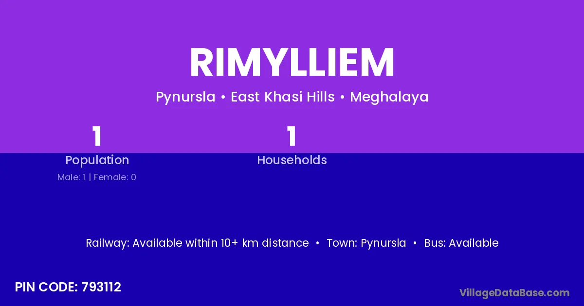 Rimylliem village has a total population of 1 people, of which 1 are males and 0 are females.