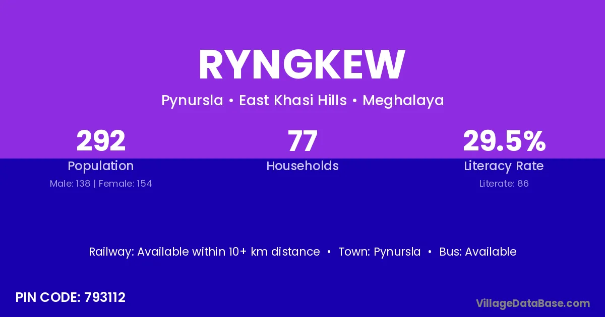 Ryngkew village has a total population of 292 people, of which 138 are males and 154 are females.
