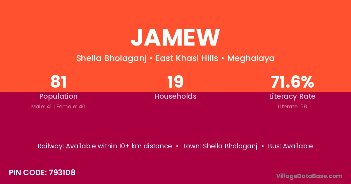 Jamew village has a total population of 81 people, of which 41 are males and 40 are females.