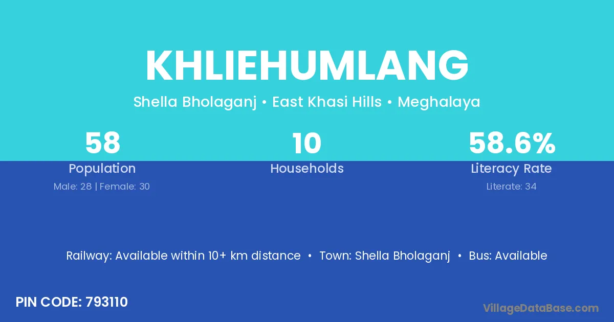 The literacy rate of Khliehumlang village is 58.62%. Male literacy stands at 39.29% and female literacy at 76.67%.