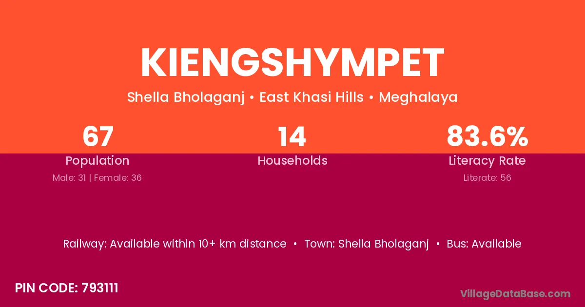 Kiengshympet village has a total population of 67 people, of which 31 are males and 36 are females.