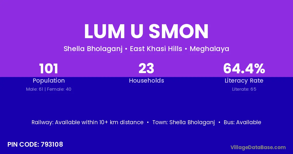 Lum U Smon village has a total population of 101 people, of which 61 are males and 40 are females.