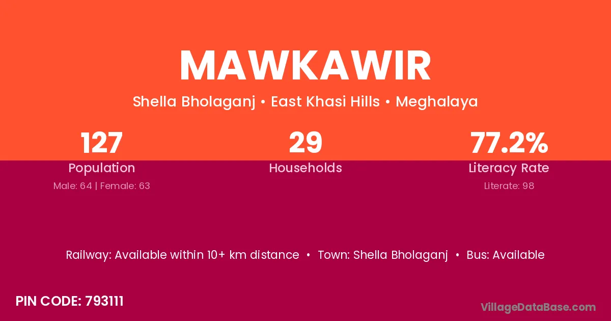 Mawkawir village has a total population of 127 people, of which 64 are males and 63 are females.