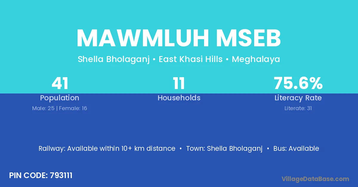 Mawmluh Mseb village has a total population of 41 people, of which 25 are males and 16 are females.