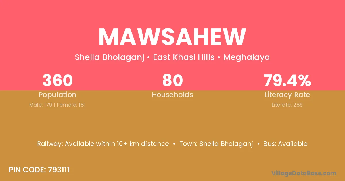 Mawsahew village has a total population of 360 people, of which 179 are males and 181 are females.