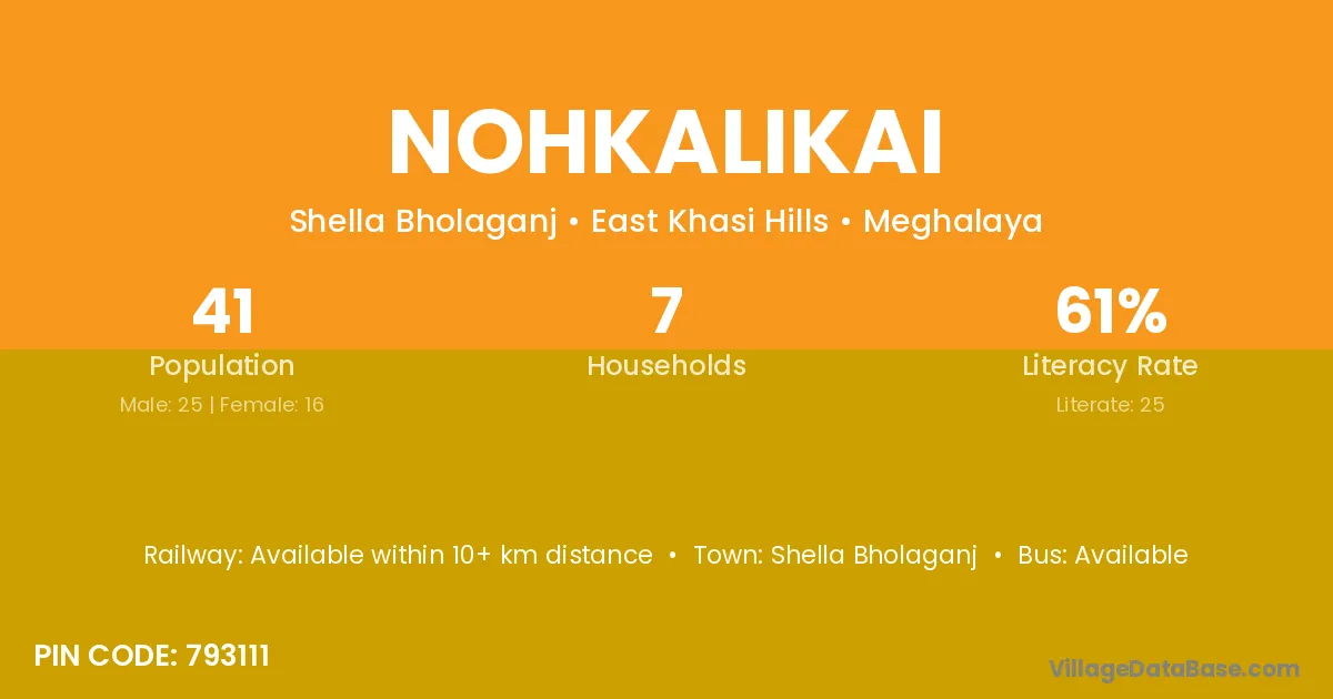 Nohkalikai village has a total population of 41 people, of which 25 are males and 16 are females.