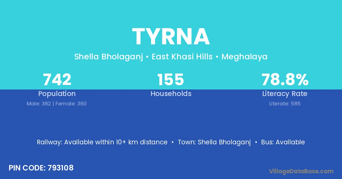 Tyrna village has a total population of 742 people, of which 382 are males and 360 are females.