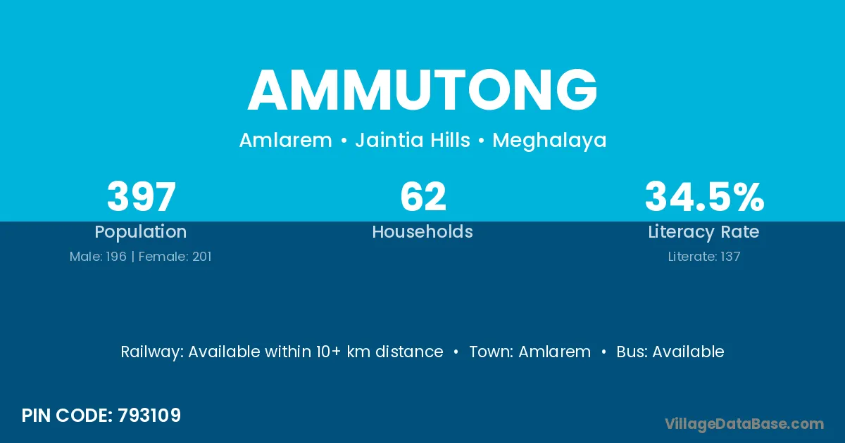 Ammutong village has a total population of 397 people, of which 196 are males and 201 are females.