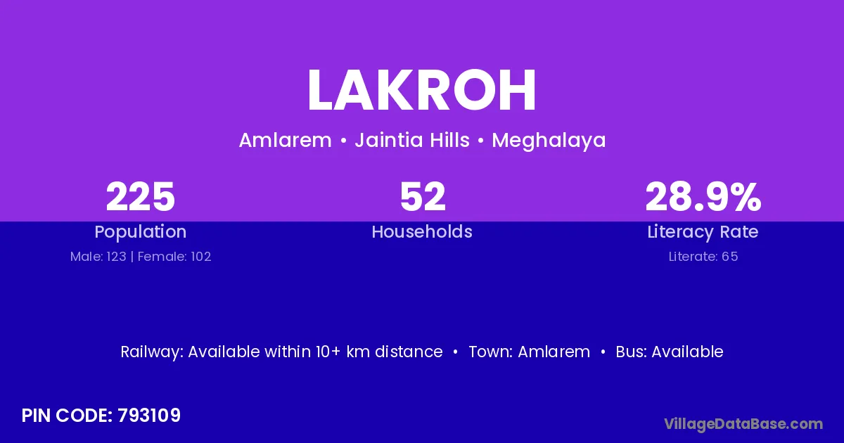Amlarem is the nearest town to Lakroh village for major economic activities