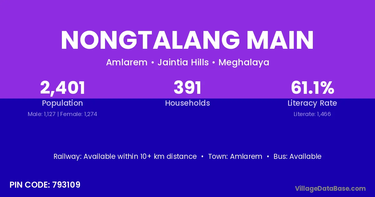 Nongtalang Main village has a total population of 2,401 people, of which 1,127 are males and 1,274 are females.
