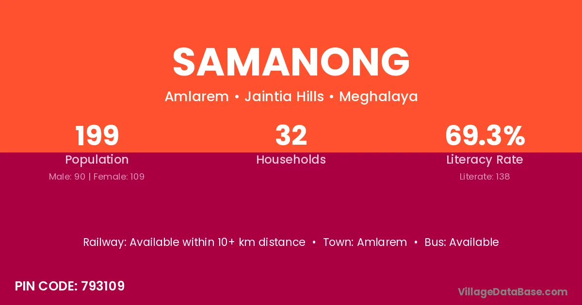 Samanong village has a total population of 199 people, of which 90 are males and 109 are females.