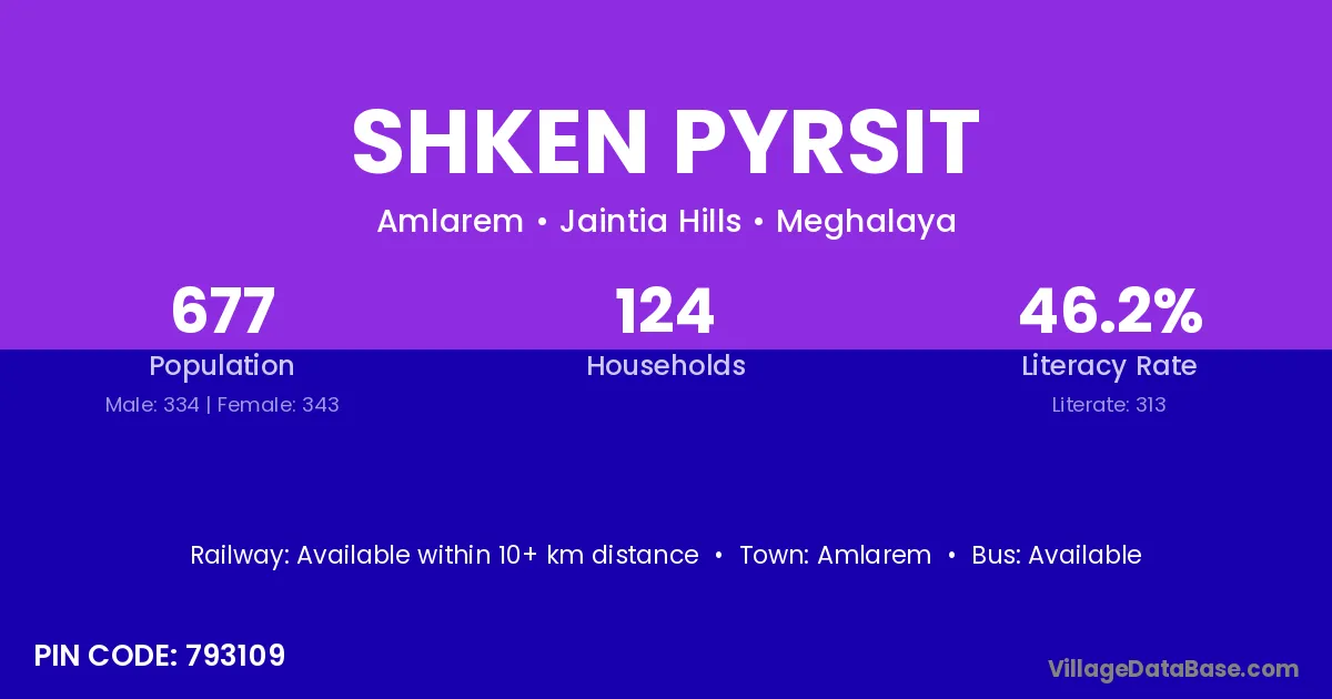 Shken Pyrsit village has a total population of 677 people, of which 334 are males and 343 are females.