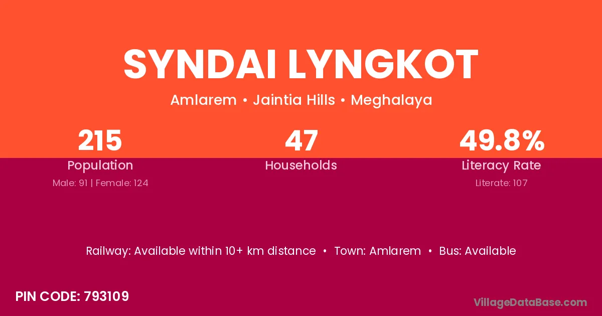 Syndai Lyngkot village has a total population of 215 people, of which 91 are males and 124 are females.