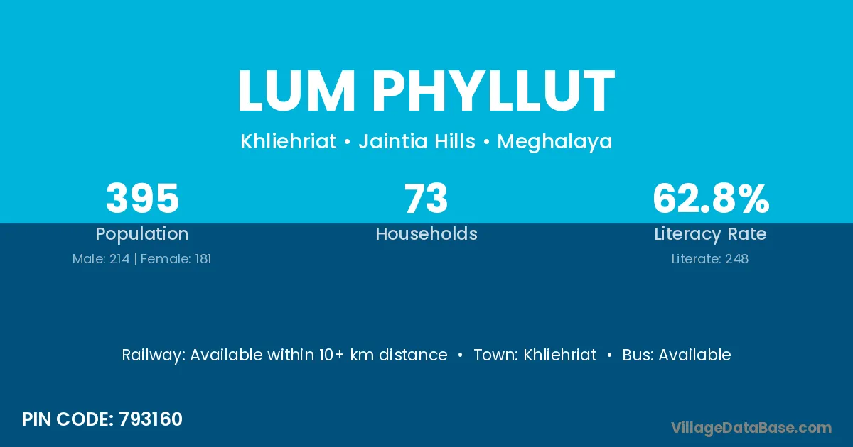 Lum Phyllut village has a total population of 395 people, of which 214 are males and 181 are females.