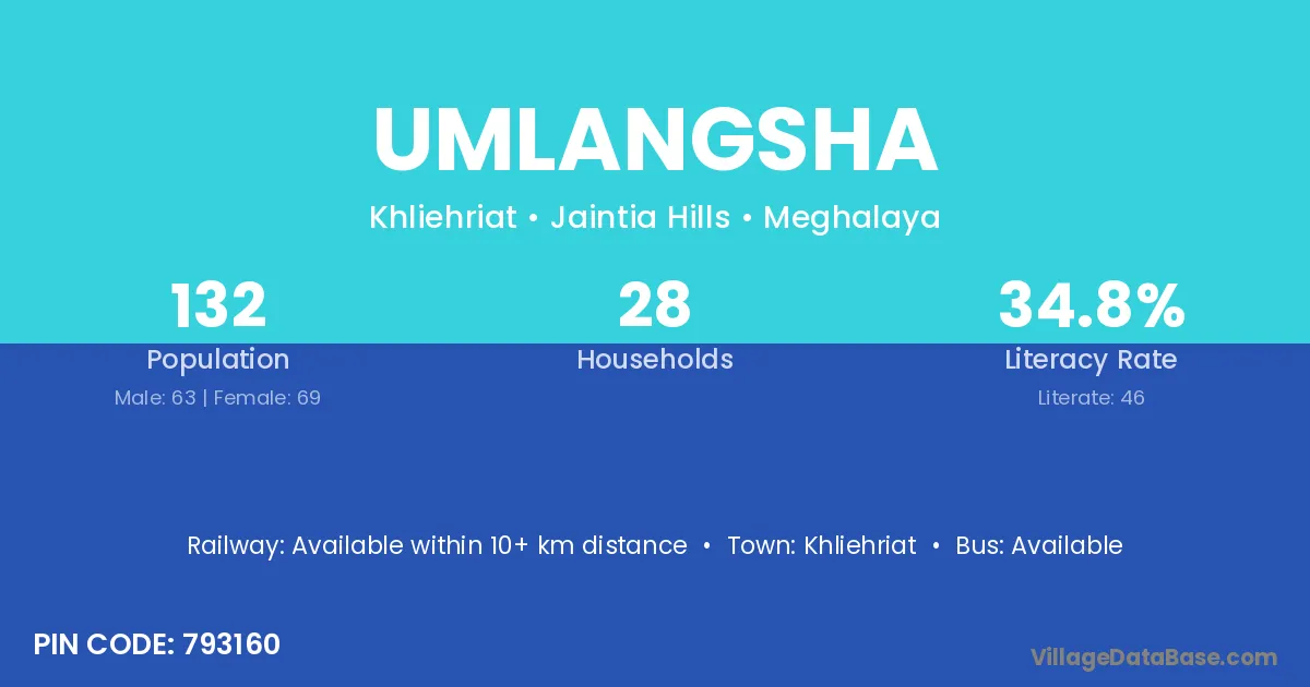 Umlangsha village has a total population of 132 people, of which 63 are males and 69 are females.