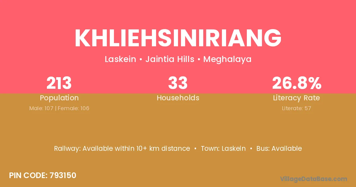 Khliehsiniriang village has a total population of 213 people, of which 107 are males and 106 are females.