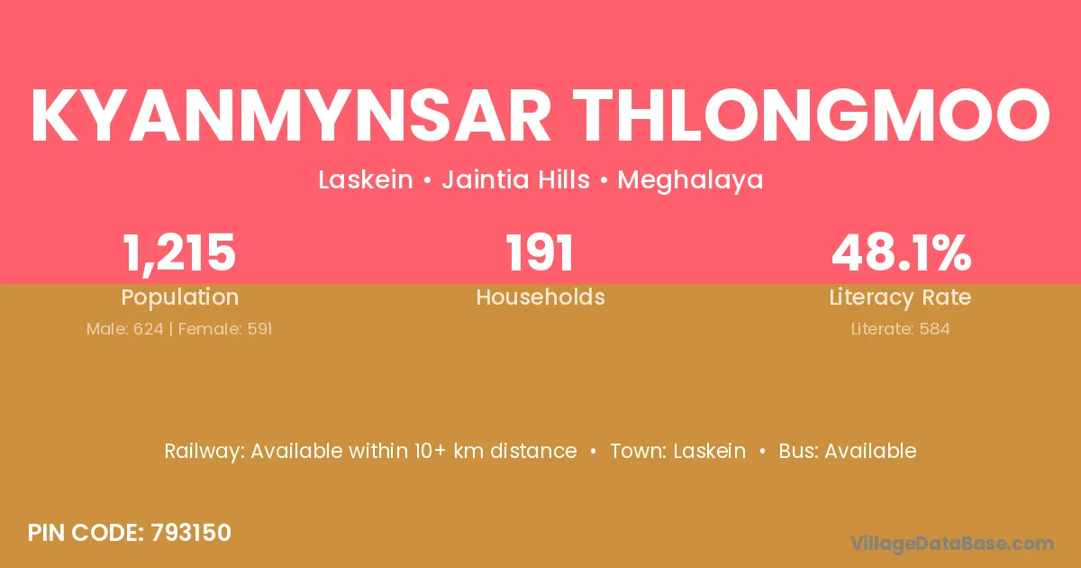 Kyanmynsar Thlongmoo village has a total population of 1,215 people, of which 624 are males and 591 are females.
