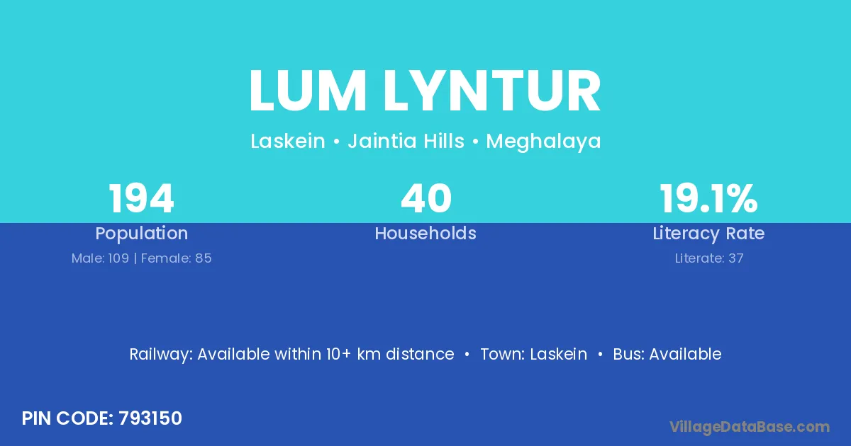 Lum Lyntur village has a total population of 194 people, of which 109 are males and 85 are females.