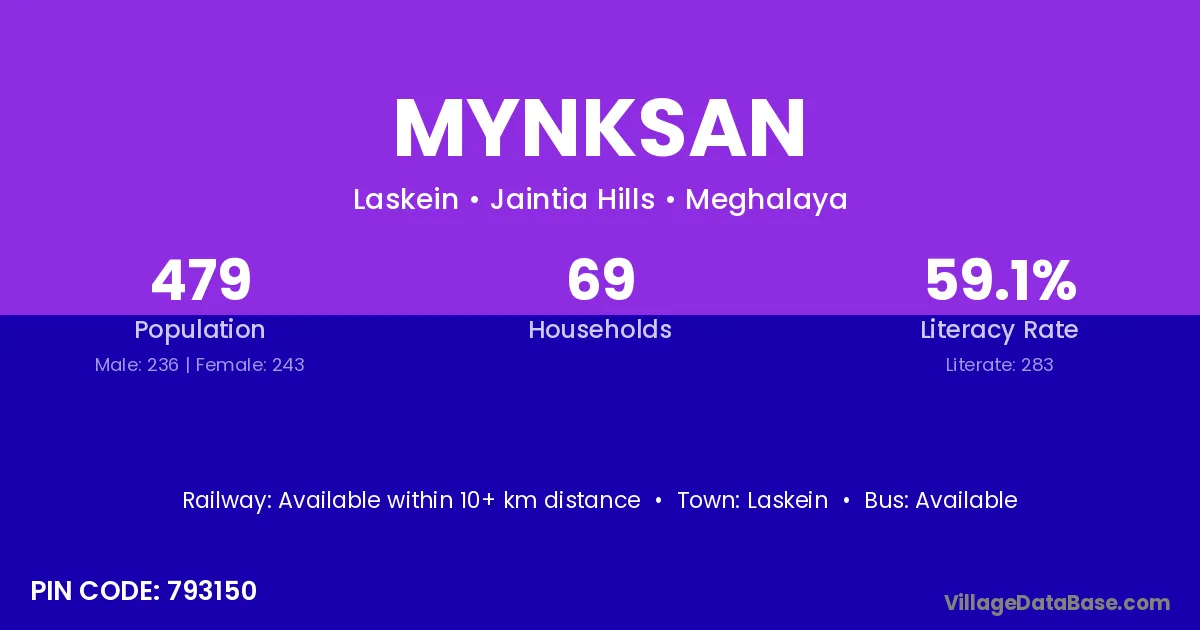 Mynksan village has a total population of 479 people, of which 236 are males and 243 are females.