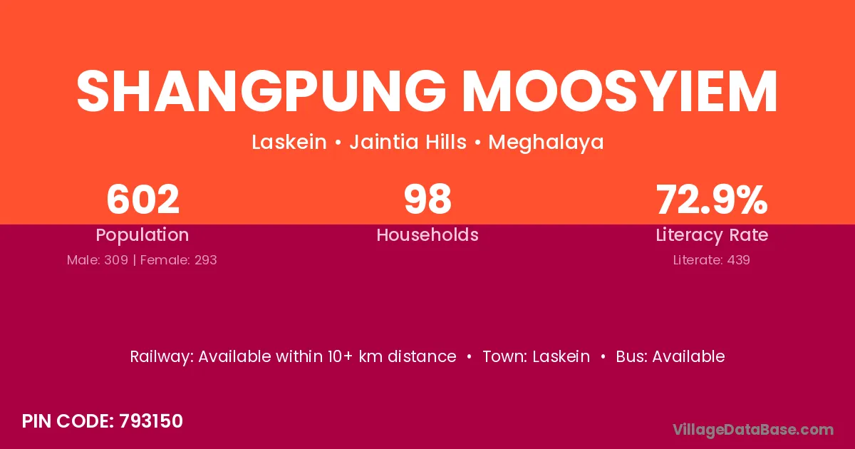Shangpung Moosyiem village has a total population of 602 people, of which 309 are males and 293 are females.