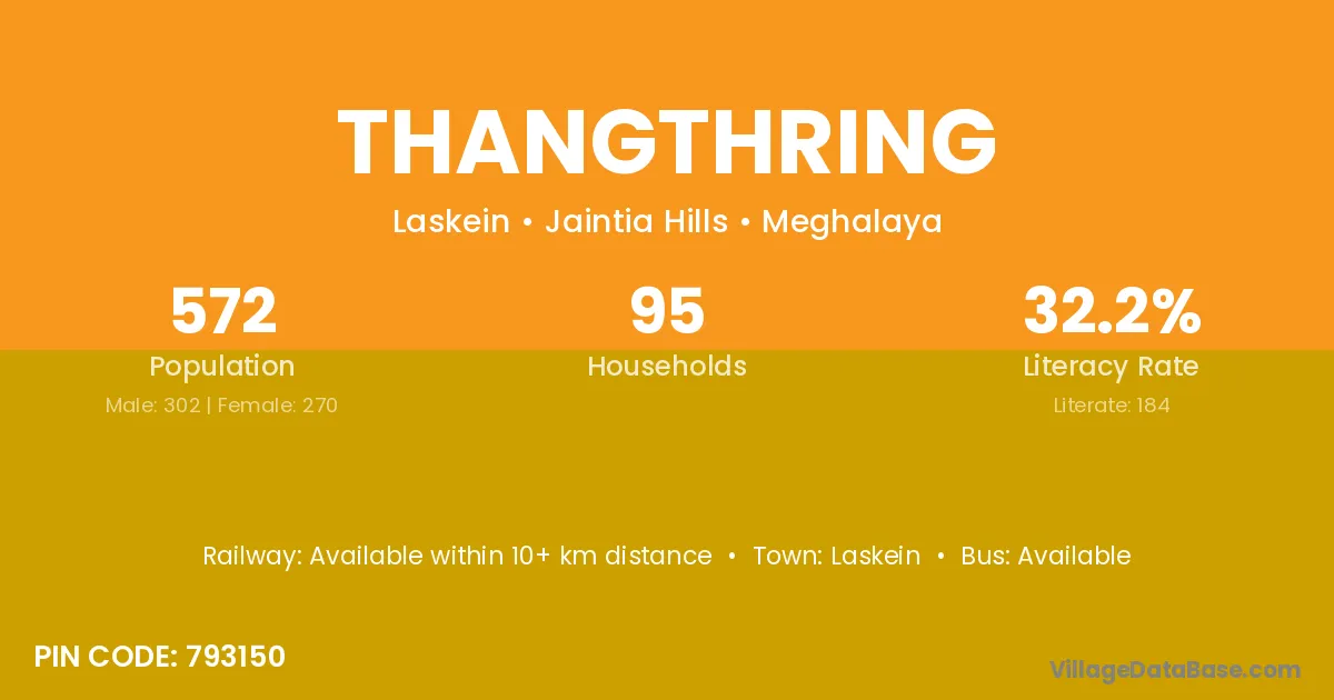 Thangthring village has a total population of 572 people, of which 302 are males and 270 are females.