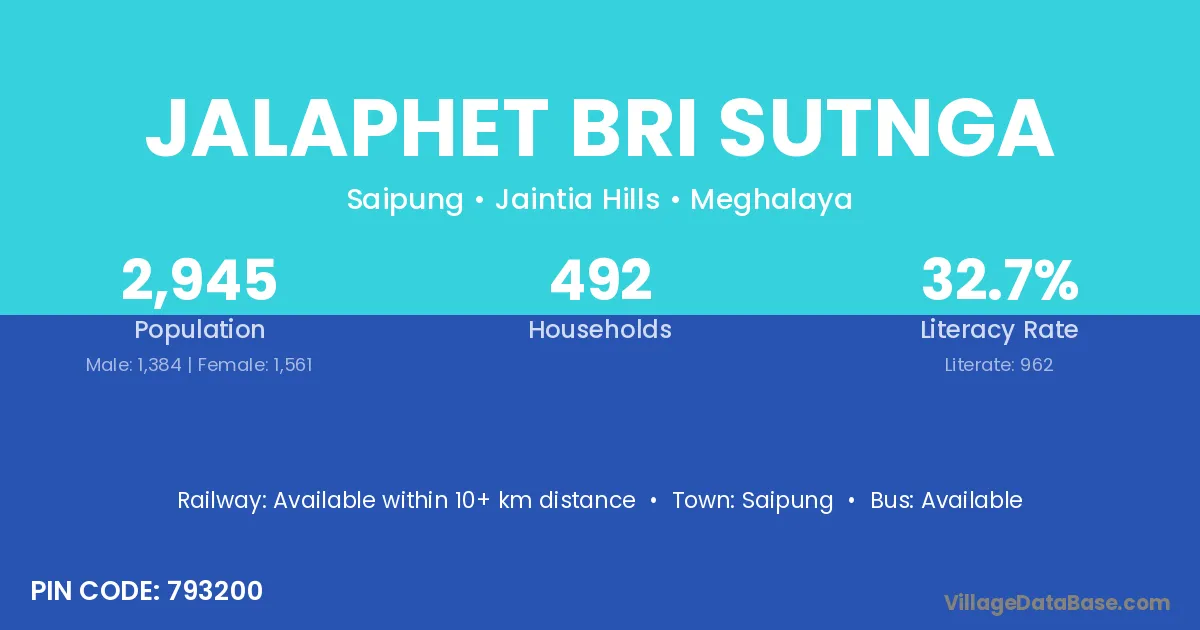 Jalaphet Bri Sutnga village has a total population of 2,945 people, of which 1,384 are males and 1,561 are females.