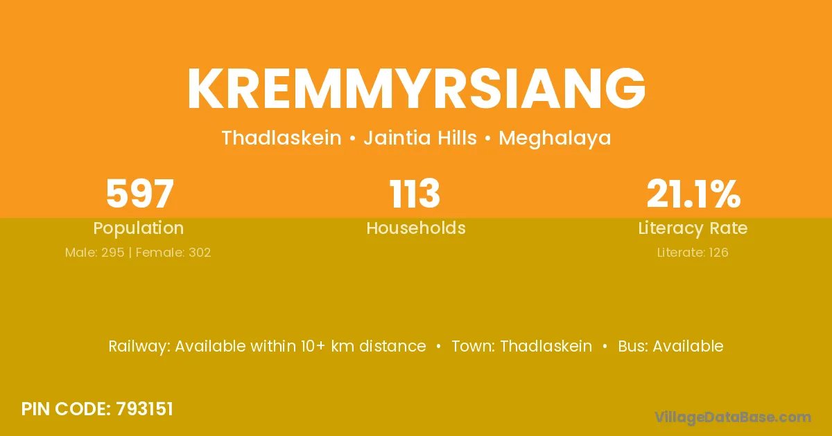 The literacy rate of Kremmyrsiang village is 42.14%. Male literacy stands at 40.00% and female literacy at 44.30%.