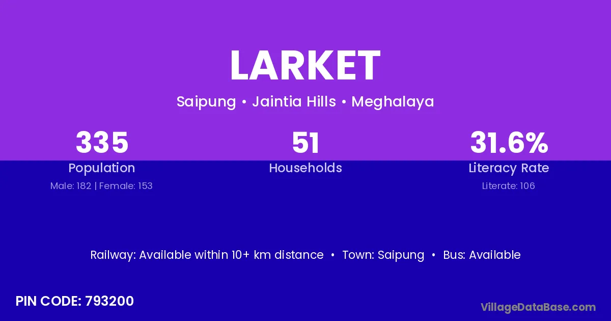 The literacy rate of Larket village is 31.64%. Male literacy stands at 28.57% and female literacy at 35.29%.