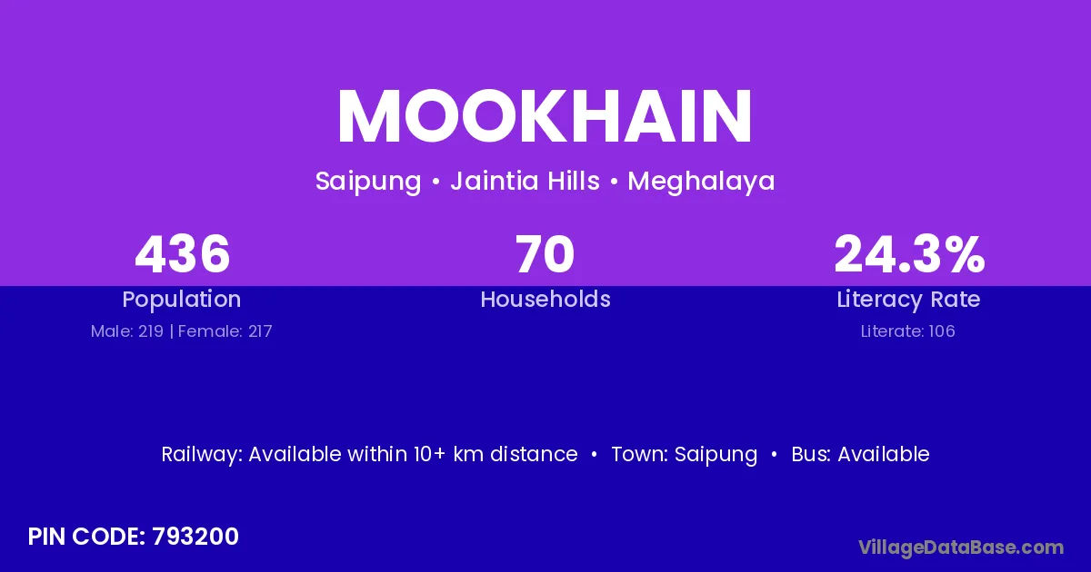 According to Census 2011 information, the village code of Mookhain village is 793200.