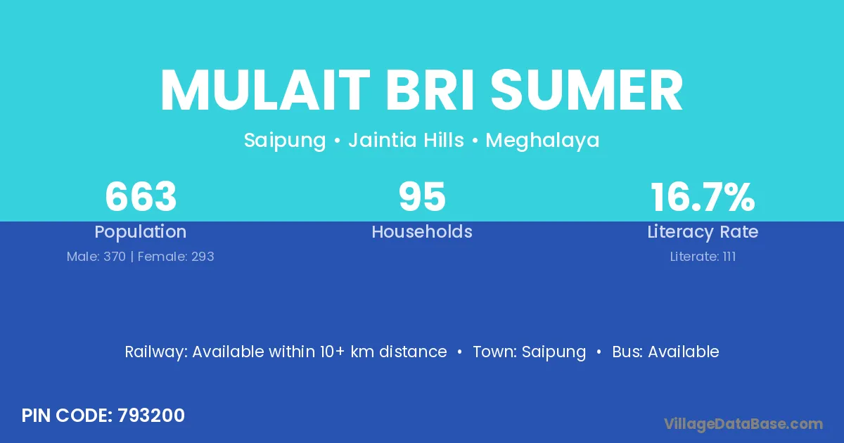 Mulait Bri Sumer village has a total population of 663 people, of which 370 are males and 293 are females.