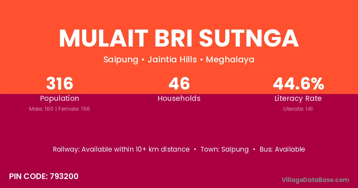 Mulait Bri Sutnga village has a total population of 316 people, of which 160 are males and 156 are females.