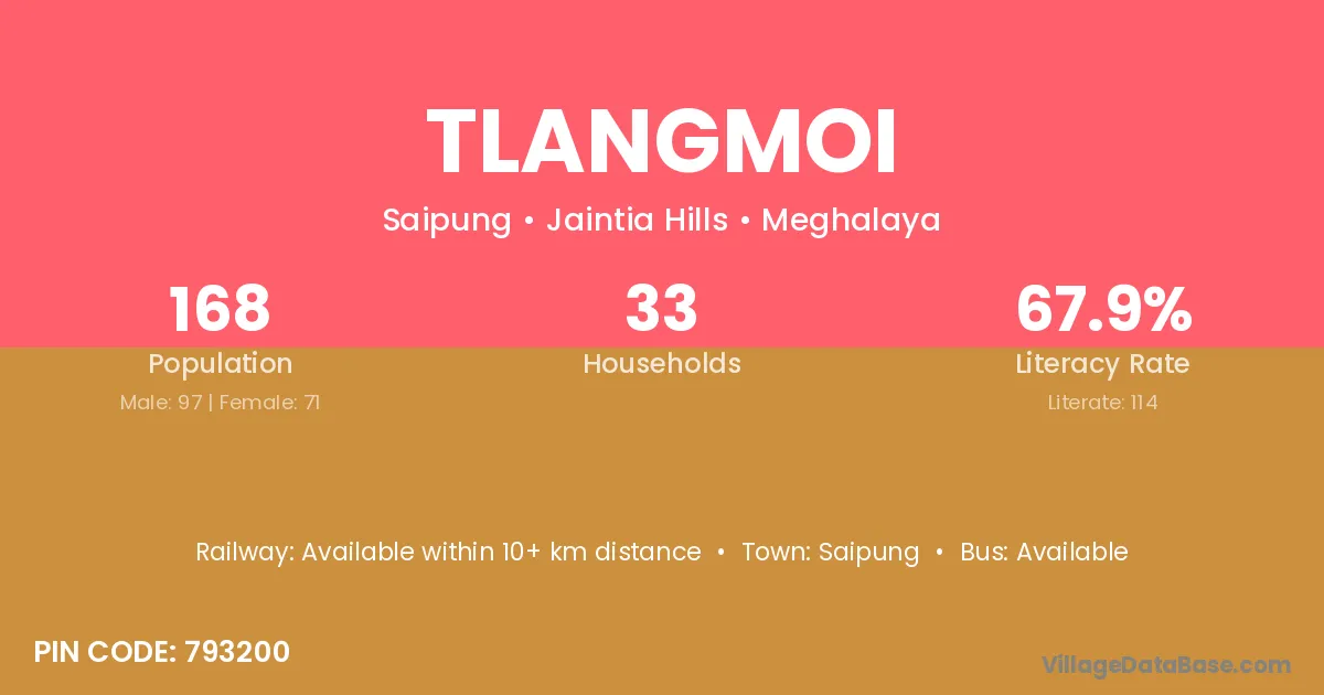 Tlangmoi village has a total population of 168 people, of which 97 are males and 71 are females.