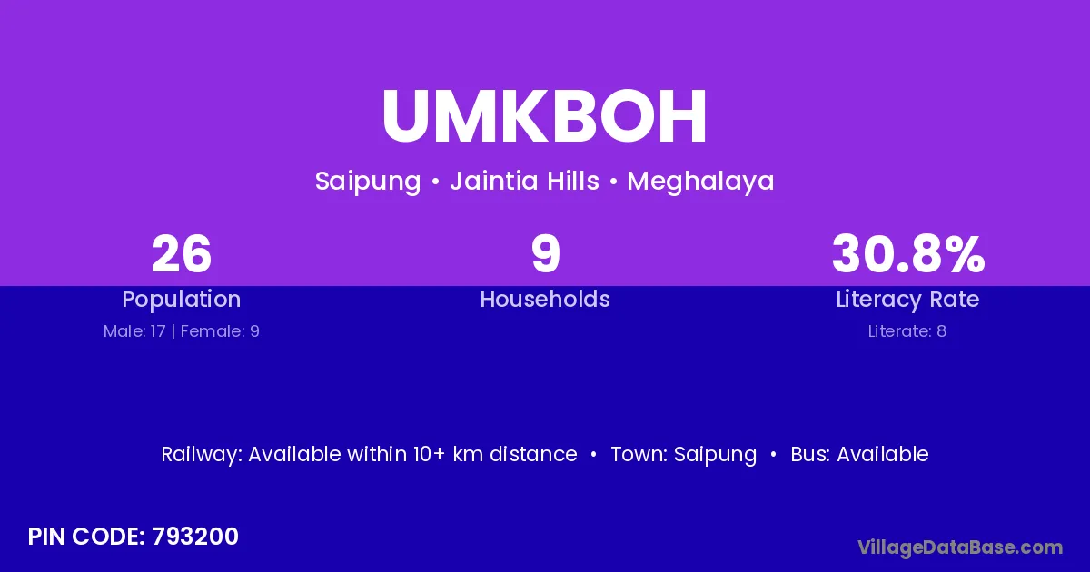 Umkboh village has a total population of 26 people, of which 17 are males and 9 are females.