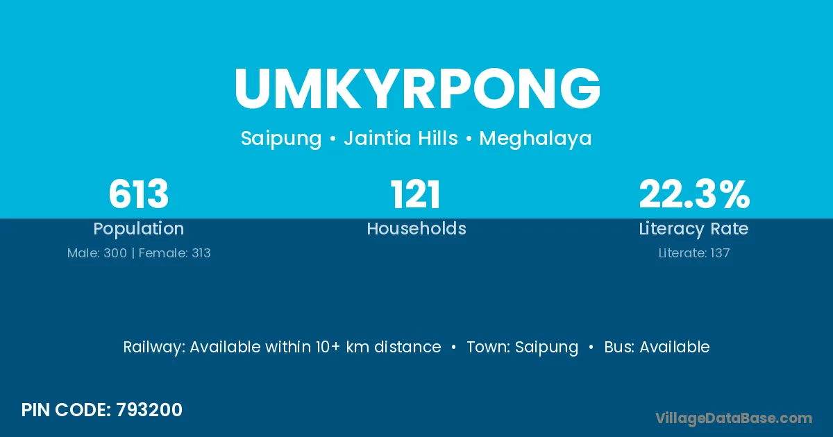 Umkyrpong village has a total population of 613 people, of which 300 are males and 313 are females.