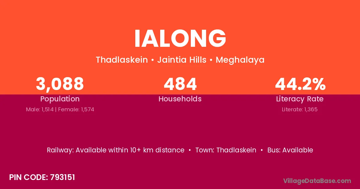 The literacy rate of Ialong village is 44.20%. Male literacy stands at 37.12% and female literacy at 51.02%.